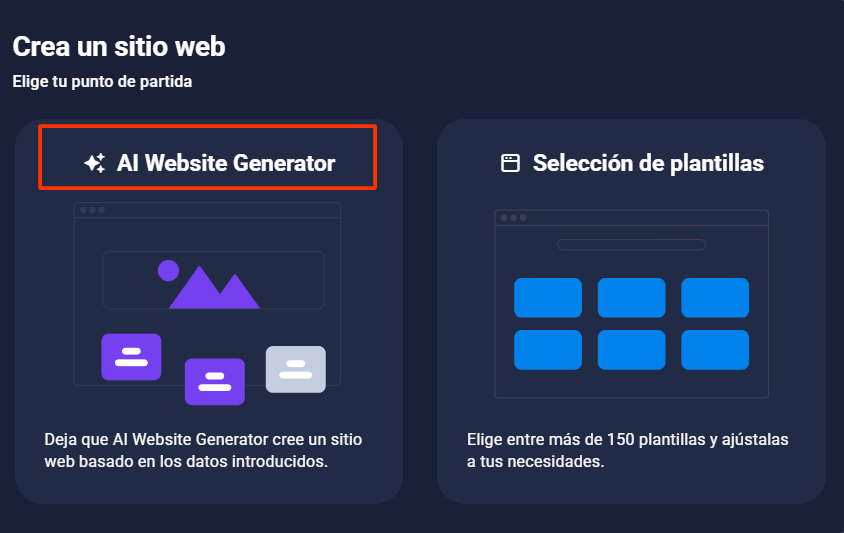 El sistema te preguntará cómo quieres empezar. Selecciona la opción "AI Website Generator" para activar la automatización.